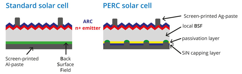 Assieme ad altre innovazioni, molti players hanno introdotto moduli con tecnologia PERC (acronimo di Passivated Emitter and Rear Cell) che sono realizzati con celle in silicio monocristallino con la passivazione dello strato posteriore. In questo modo si consente un aumento della possibilità di ricombinazione dei fotoni e l’aumento della riflessione interna alla giunzione.