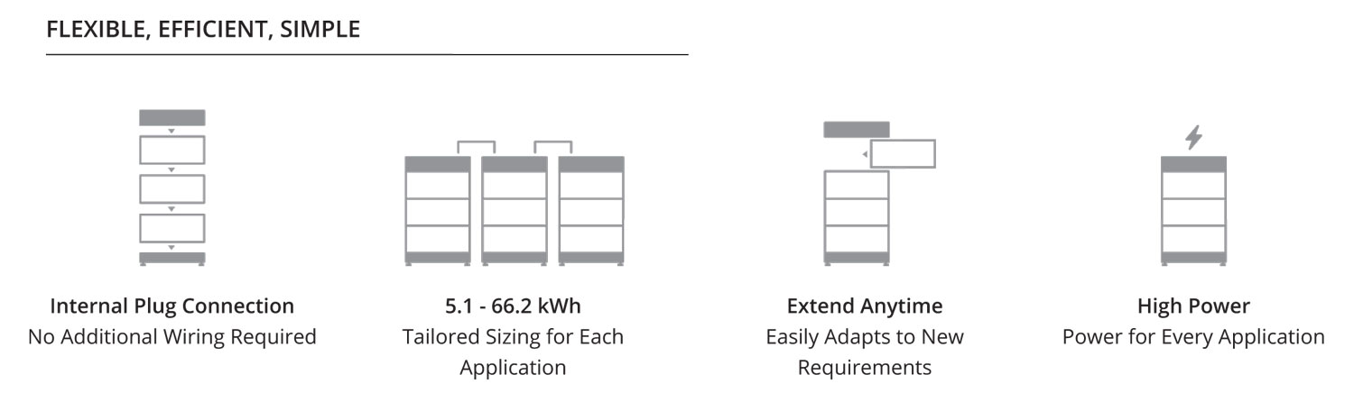 The Premium HVM Battery Boxes are made up of 3 to 8 modules in series for an overall capacity of between 8.3 and 22.1 kWh. As in the case of Premium HVS, up to 3 series of modules can be paralleled, for a maximum capacity of 66.2 kWh.