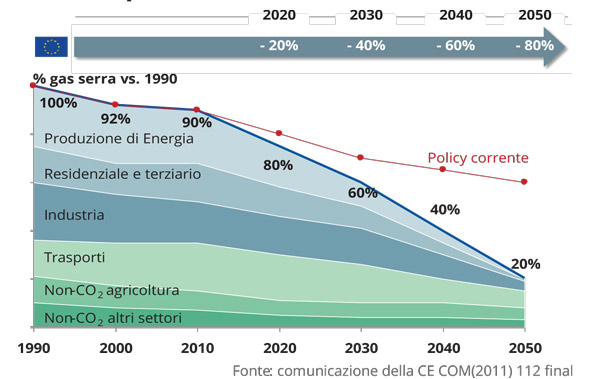 In coerenza con gli impegni di Kyoto la Commissione Europea ha definito una Roadmap di decarbonizzazione per ridurre, almeno dell’80%, le emissioni di gas serra entro il 2050 (rispetto ai livelli del 1990).