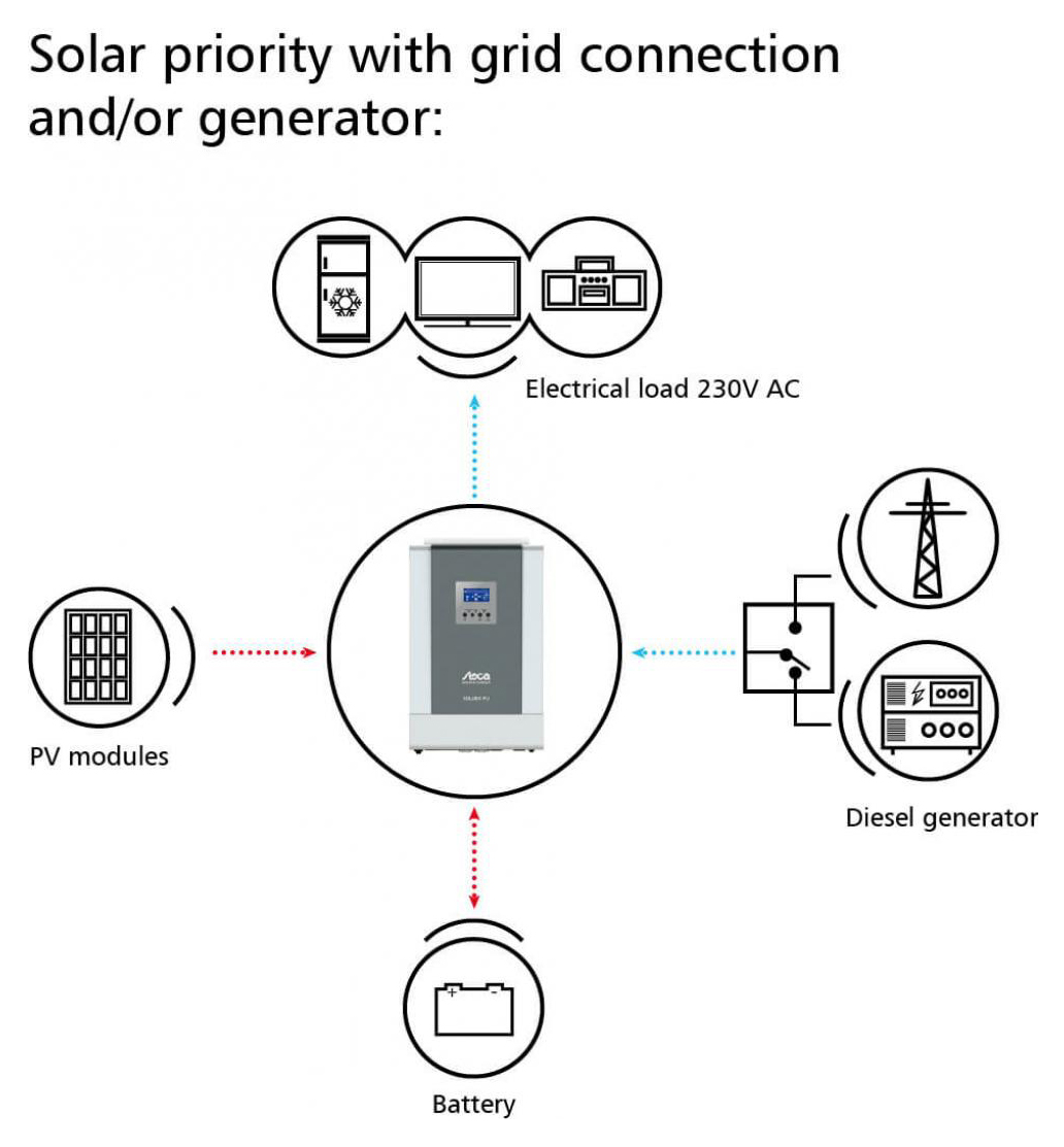Questa serie di inverter all-in-one permettono di fornire al consumatore un’alimentazione a 230 V CA, la possibilità di cambiare molto velocemente la sorgente energetica in 10ms, selezione di priorità di energia flessibile, inoltre il dispositivo può essere usato anche come gruppo di continuità.