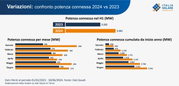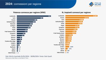 Nel 2024 la potenza connessa è pari a 3.341 MW in crescita del 44% rispetto al primo semestre del 2023. I nuovi impianti connessi risultano 169.003.