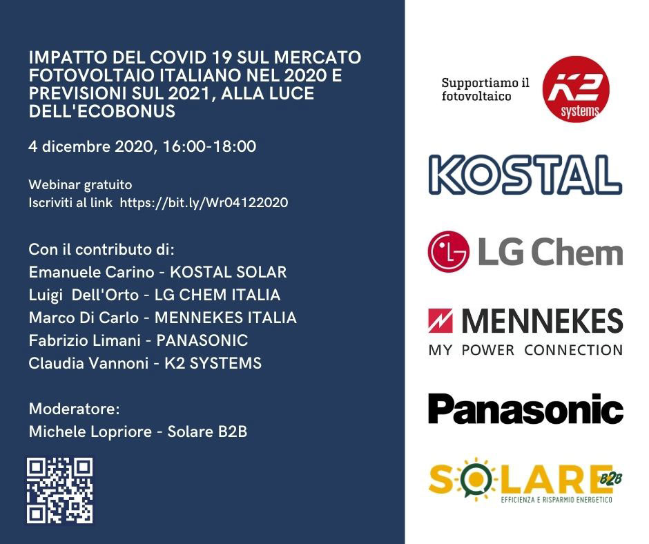 La conferenza si terra venerdì 4 dicembre 2020 e coinvolgerà K2 Systems, Kostal Solar, LG Chem, Mennekes, Panasonic e come mediatore la testata Solare B2B.