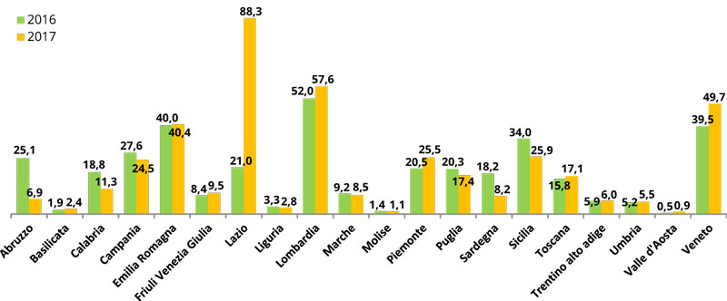 Analizzando la potenza installata in ogni regione risulta che le regioni che hanno installato di più sono il Lazio, con 88,3 MW, la Lombardia, con 57,6 MW e il Veneto con 49,7 MW.