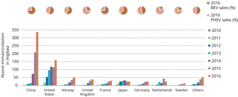 Vendite di auto elettriche (BEV e PHEV) in vari paese dal 2010 al 2016