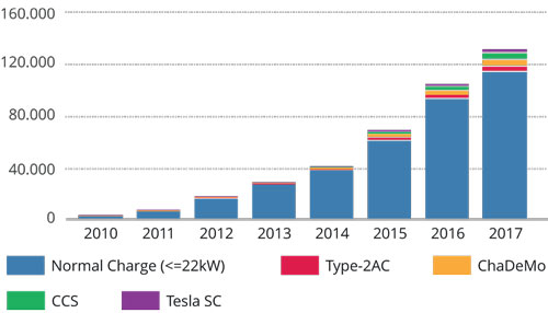 Un altro dato interessante è la crescita del numero di punti di ricarica in Europa di cui i possessori di auto elettriche o plug-in possono usufruire; in particolare la crescita più rilevante si ha per quelli con potenza minore di 22 kW, come si può osservare dal grafico seguente:
