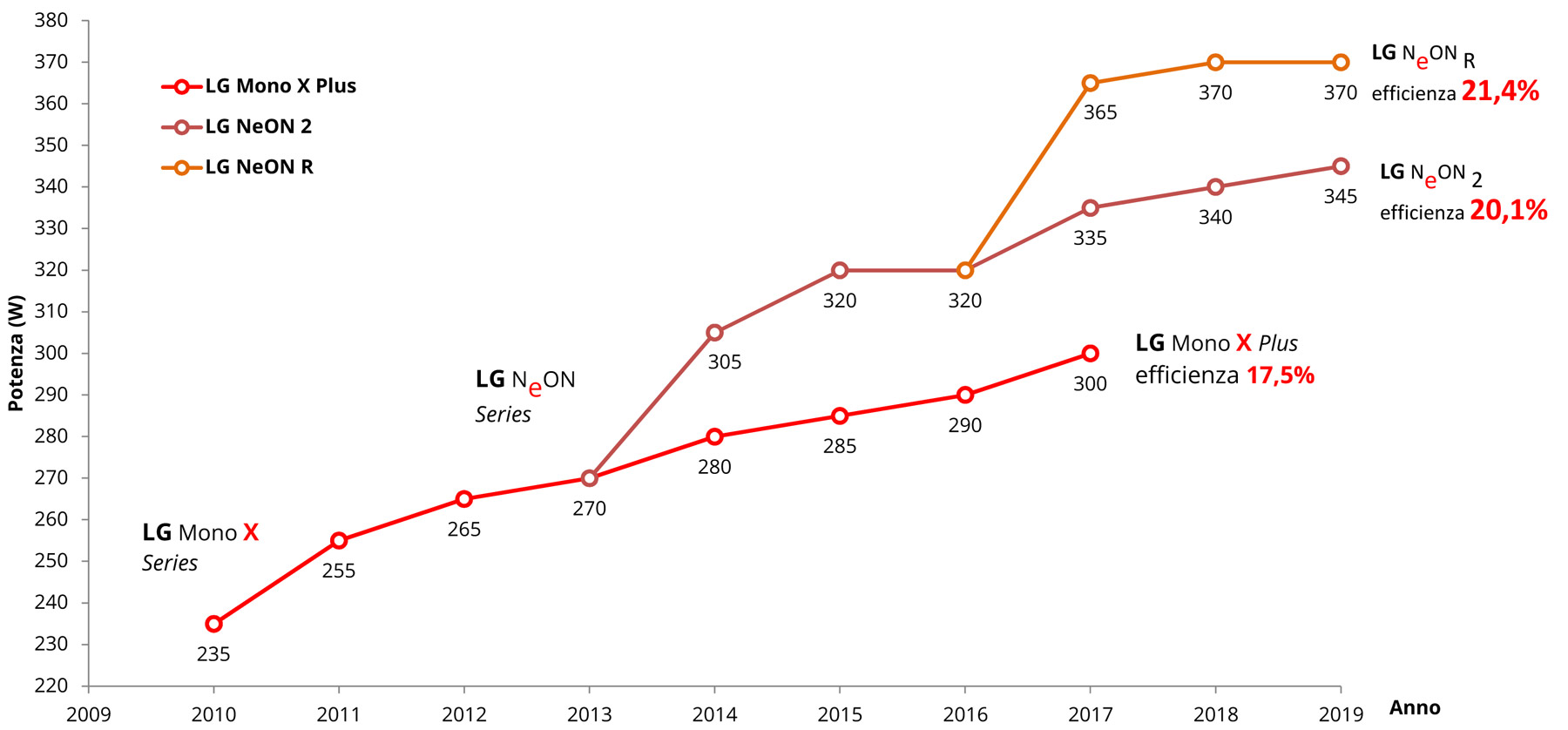 Come si può vedere nel grafico, nel 2019 la gamma di pannelli prevede al momento fino a 370 W con 21.4% d’efficienza per il NeON R e 345 W con 20.1% d’efficienza per il NeON 2.
