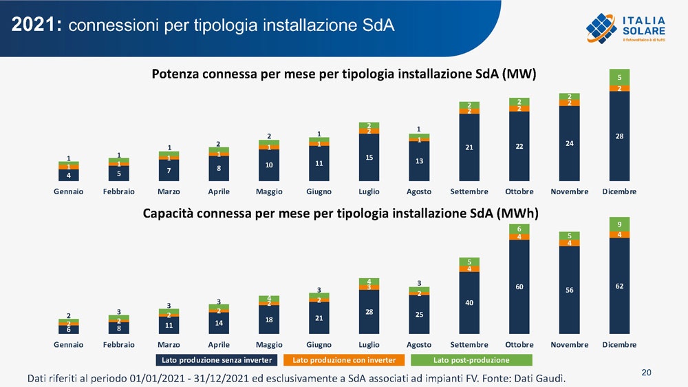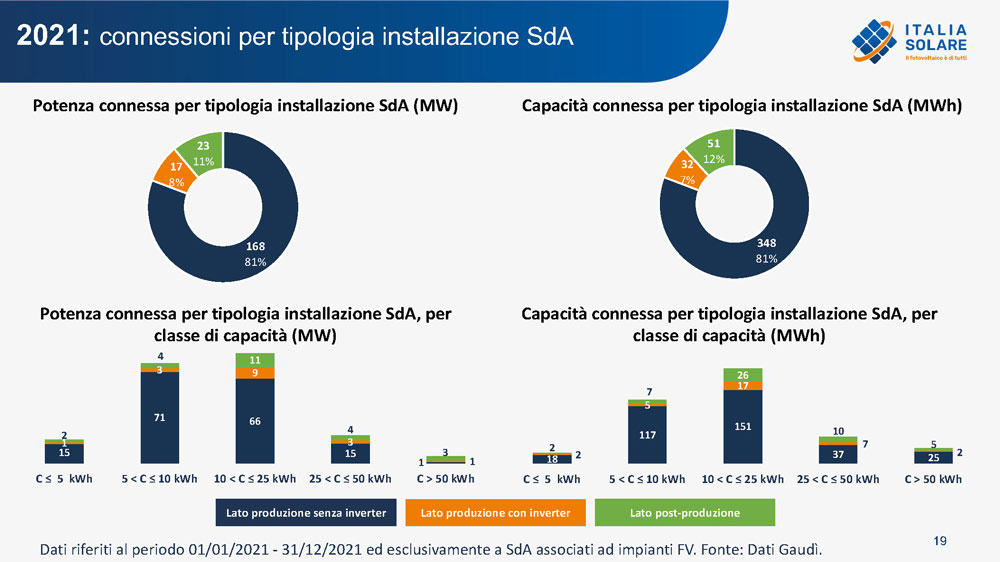 Nel 2021 queste percentuali si sono spostate in favore della connessione in continua, poiché ben l’81% degli accumuli di quest’anno sono di questo tipo.