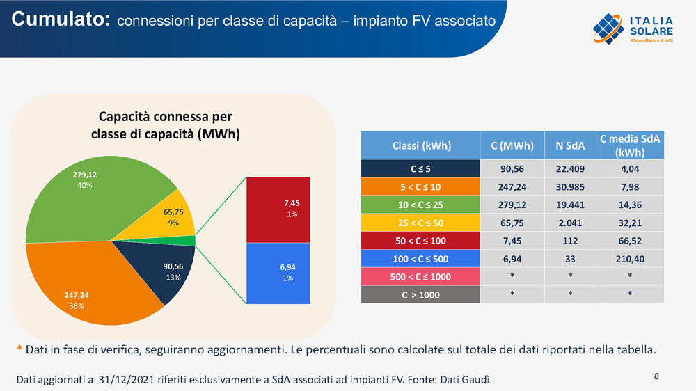 Che il Super Bonus abbia dato comunque una spinta fondamentale a questa incredibile crescita annuale lo si può notare anche guardando le classi di capacità installate poiché l’89% della nuova capacità è costituita da sistemi con batterie da meno di 50 kWh, ricordiamo come il Super Bonus 110% prevede un rimborso di 1000 €/kWh con un massimale di 48 mila euro.