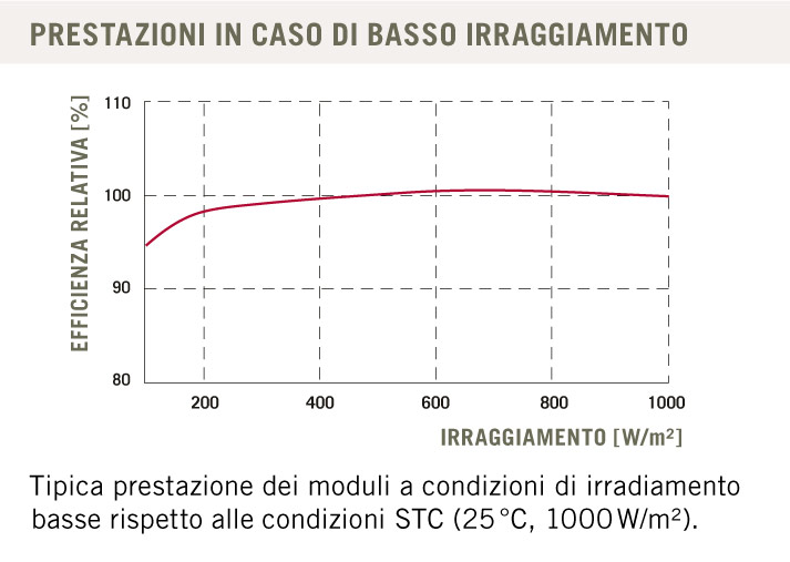 Rendimenti ottimi in tutte le condizioni atmosferiche con prestazioni straordinarie in caso di scarsa luminosità e alte temperature. Massime prestazioni in tutte le condizioni atmosferiche.