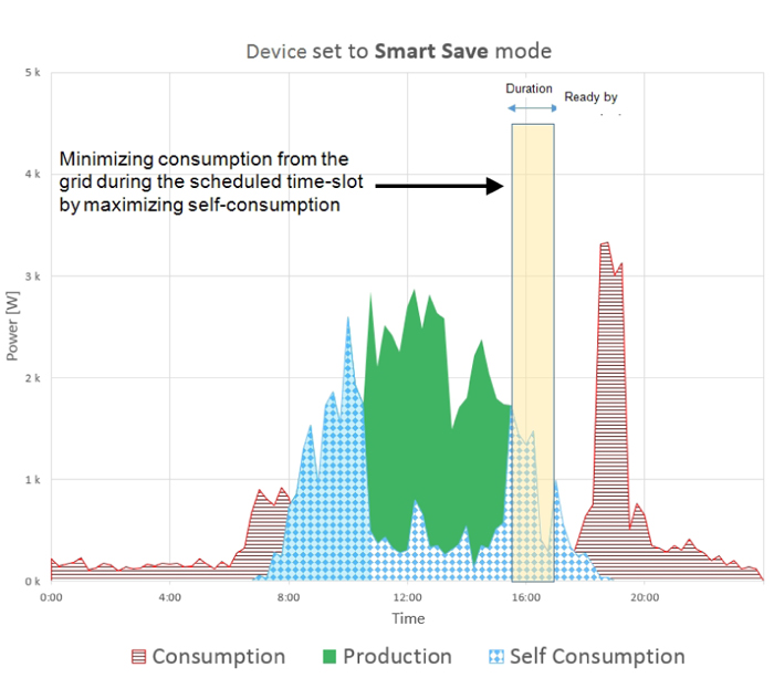 Più in dettaglio, nella modalità “auto” -“Smart Save”, il contatto di un relè viene gestito in modo tale da avere sicuramente l’auto carica e disponibile ad un certo orario, ma di poter sfruttare l’energia dal fotovoltaico quando è in eccesso rispetto ai consumi delle altre utenze.