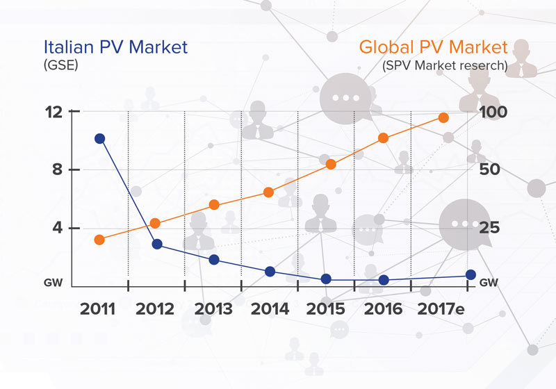 L’Italia, che nel 2011 aveva installato secondo il GSE più di 9 GW di fotovoltaico rispetto ai circa 23 GW globali, nel 2017 registrerà un nuovo installato di meno di 0,4 GW rispetto ai circa 100 GW globali: una debacle.