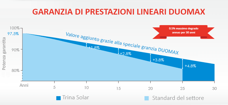 Il decadimento garantito in 30 anni è dello 0.5% annuo e garanzia sul prodotto di 10 anni.