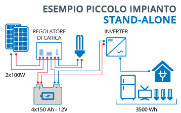 Gli impianti stand-alone sono impianti non connessi alla rete di distribuzione dell’energia elettrica: tutta l’energia prodotta viene immagazzinata ed utilizzata in loco. Importante è il dimensionamento Possono essere di diverse