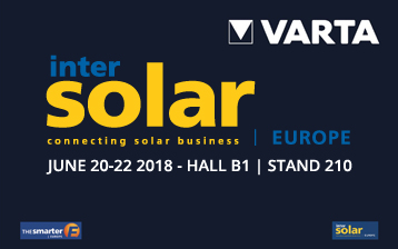 VARTA Storage espone all’Intersolar 2018 a Monaco di Baviera dal 20 al 22 giugno 2018, nella sezione EES – Electrical Energy Storage nel padiglione B1 allo stand 210. VARTA invita
