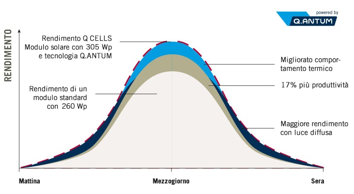 Q Cells adotta l’innovativa tecnologia Q.ANTUM nella produzione di celle solari per i propri moduli fotovoltaici, che consente di ottimizzare le prestazioni di conversione nelle condizioni reali, come ad esempio nel caso di limitata luminosità, o di elevata temperatura, situazioni che limitano la produzione fotovoltaica.